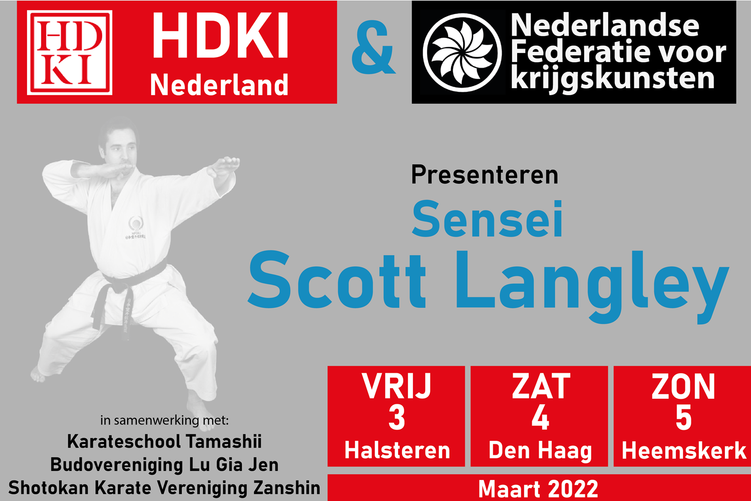 Alweer de 13e keer dat sensei Scott Langley naar Nederland komt. Dit keer geeft hij 3 dagen les. Op vrijdag 3 maart in Halsteren, op zaterdag 4 maart in Den Haag en op zondag 5 maart in Heemskerk. Oftewel het Dutch weekend.