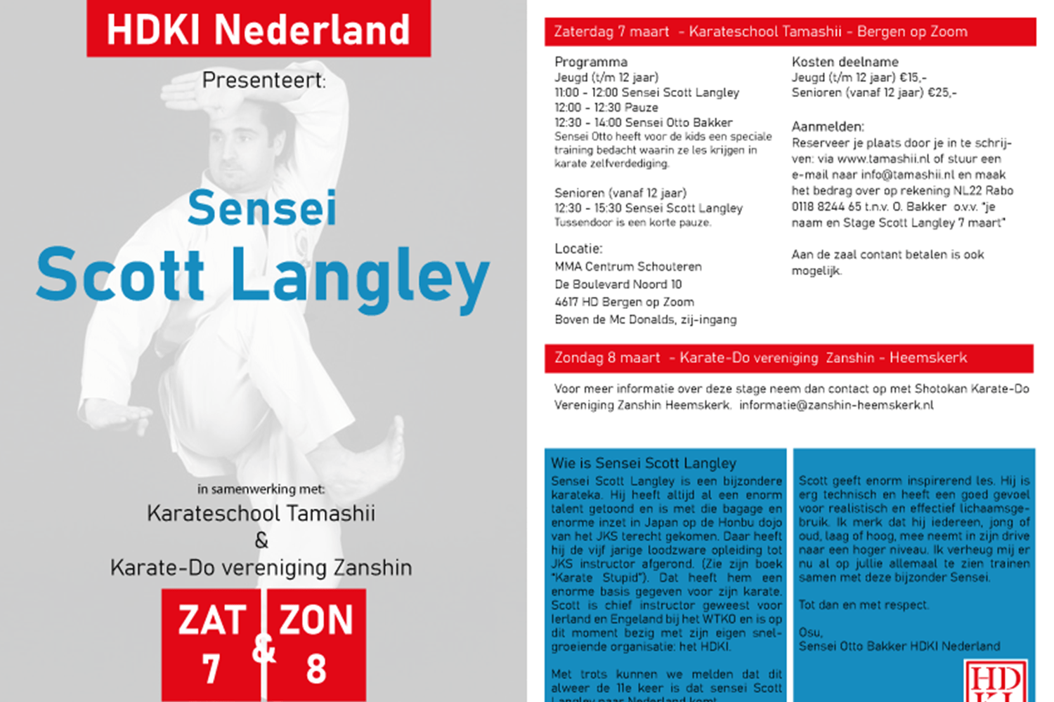 Voor de 11e keer alweer komt sensei Scott Langley naar Nederland en geeft hij een stage op 7 maart bij Tamashii in Bergen op Zoom en op 8 maart in Heemskerk.