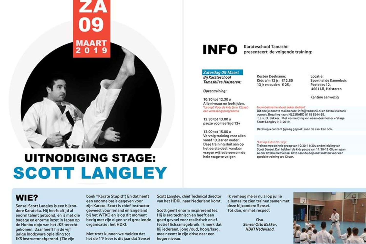 Op zaterdag 9 maart 2019 geeft Scott Langley sensei voor de 11e keer een trainingsstage karate bij “Tamashii” te Halsteren. Er wordt onder andere Kata “Meikyo Nidan” getraind met uitgebreide bunkai.