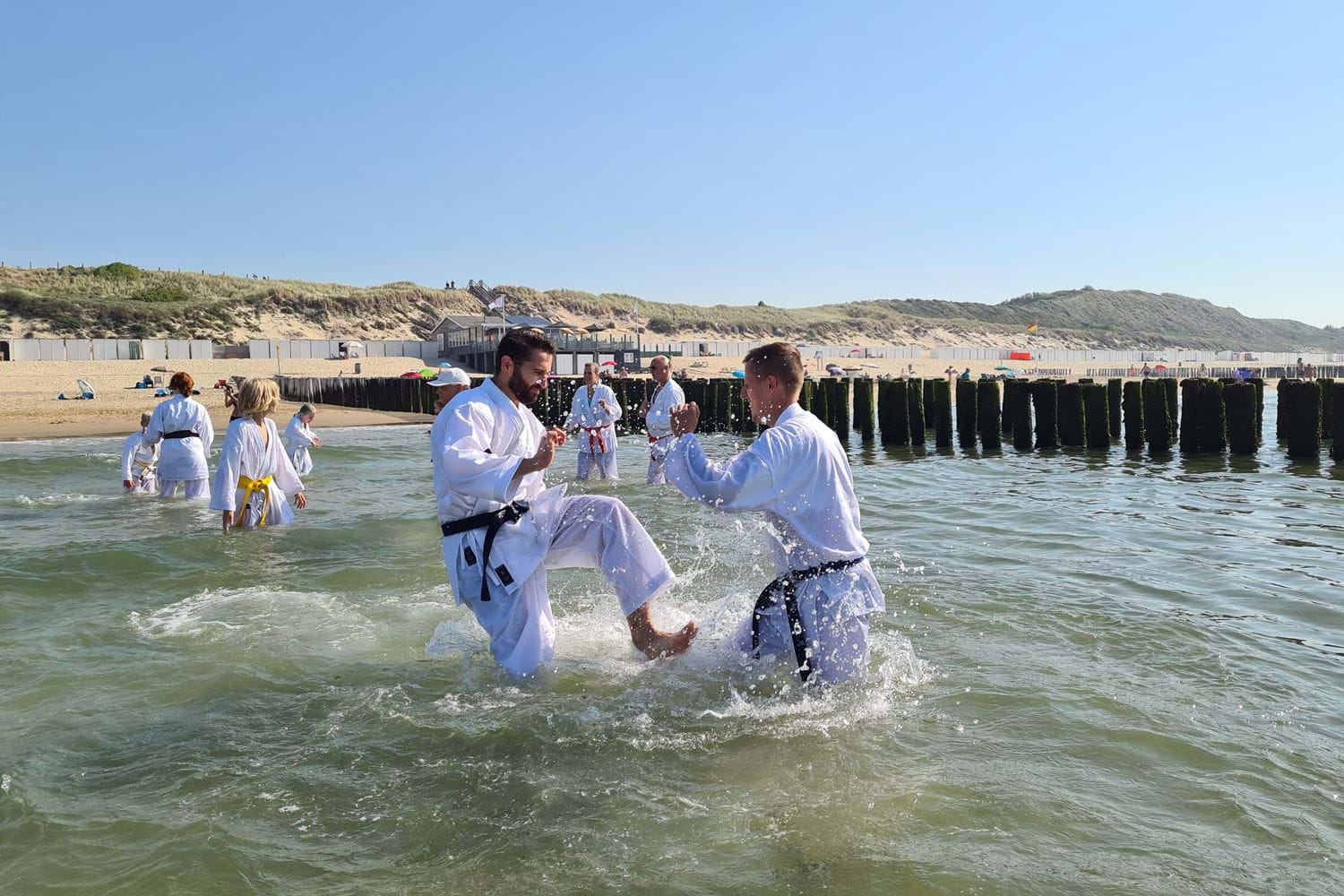 Meer dan 30 karateka's van Tamashii waren naar het strand van Zoutelande gekomen om te trainen.