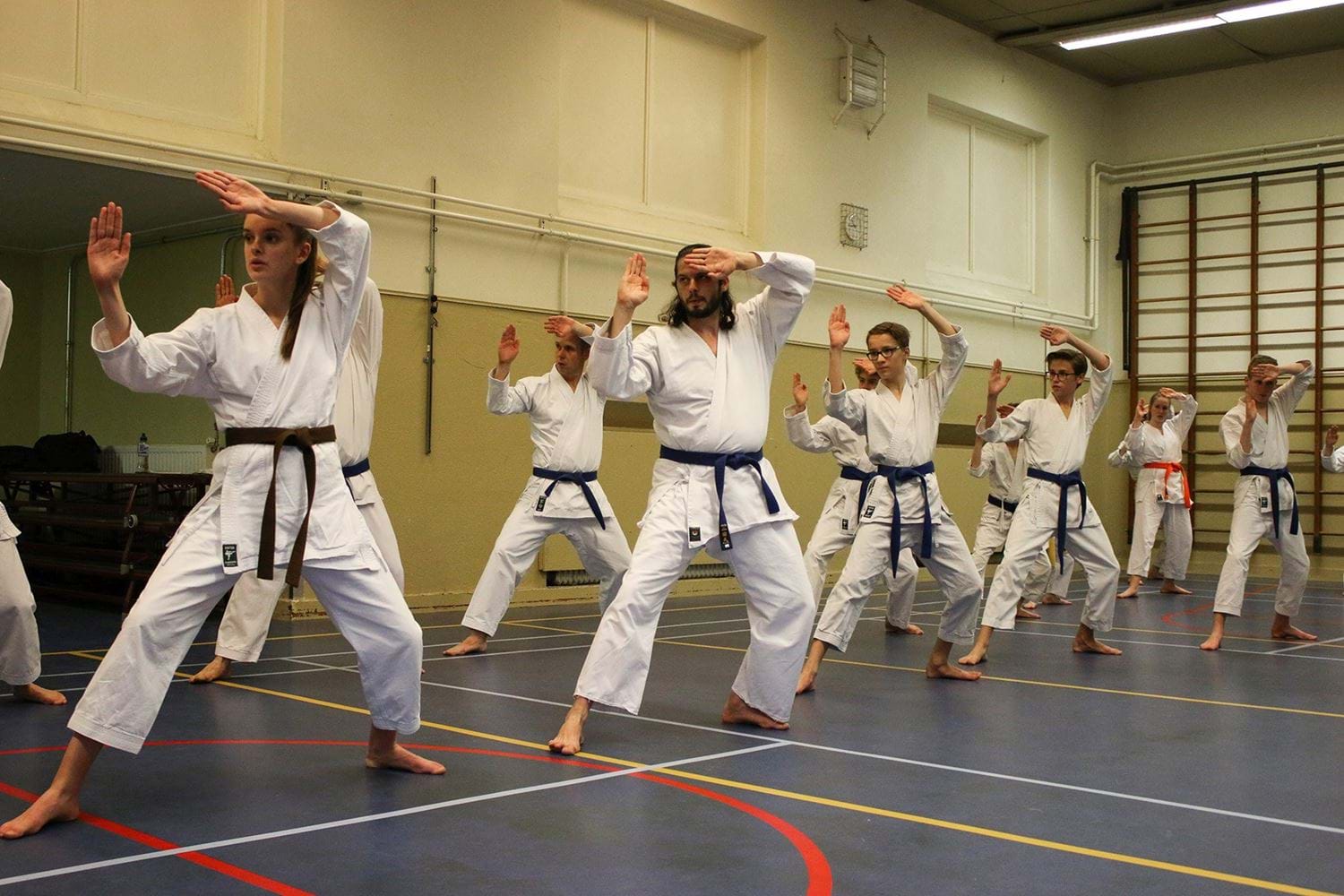 - Binnen krijg je jouw vaste plek. Vanaf die plek groeten we ook aan en af en doen we de warming up